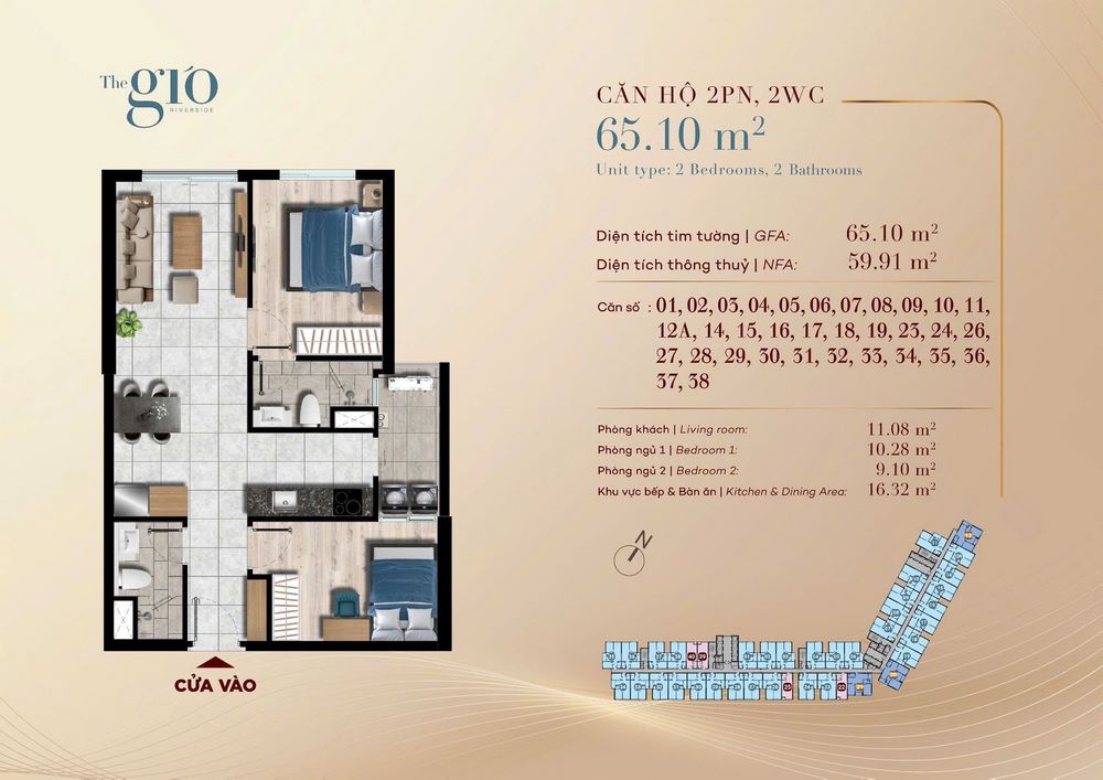 Căn 2PN diện tích 65m2: Chiếm tỉ lệ 80%