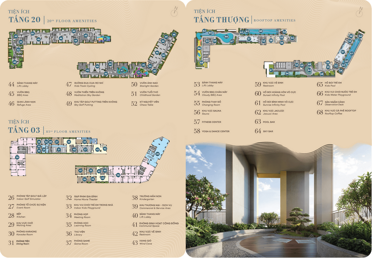 Công viên, hồ bơi, khu thể thao, nhà sinh hoạt cộng đồng, khu vui chơi giải trí, sky bar, sky lounge,..